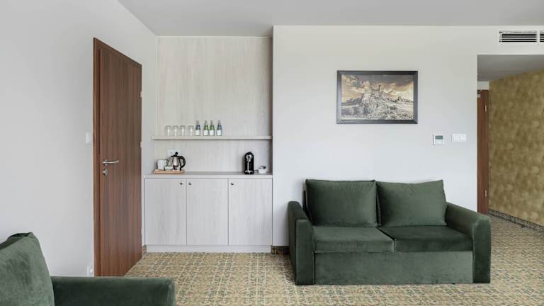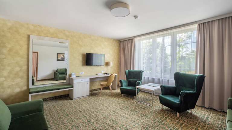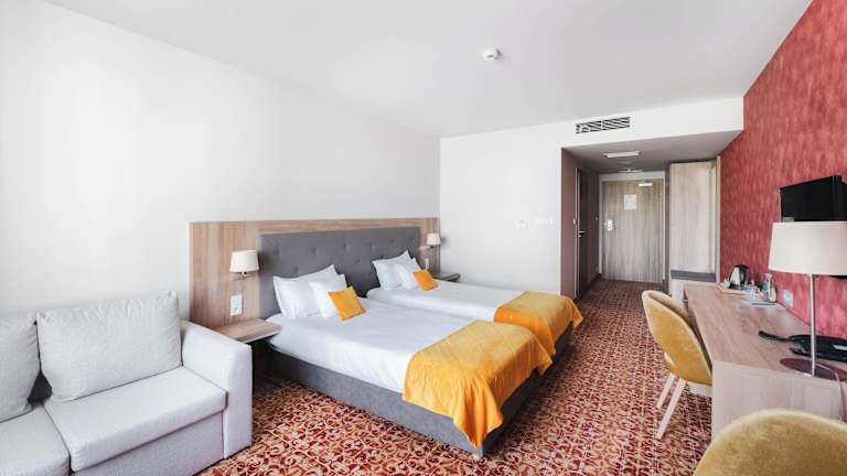 Die Zimmer sind klimatisiert und verfügen über ein Doppelbett sowie ein Sofabett. Ein Wasserkocher ist ebenfalls vorhanden. Die Ausstattung umfasst einen Flachbild-TV, ein eigenes Bad mit Dusche, kostenlose Pflegeprodukte und einen Haartrockner. Einige Zimmer bieten einen Sitzbereich. Es sind zudem rollstuhlgerechte Zimmer erhältlich.
