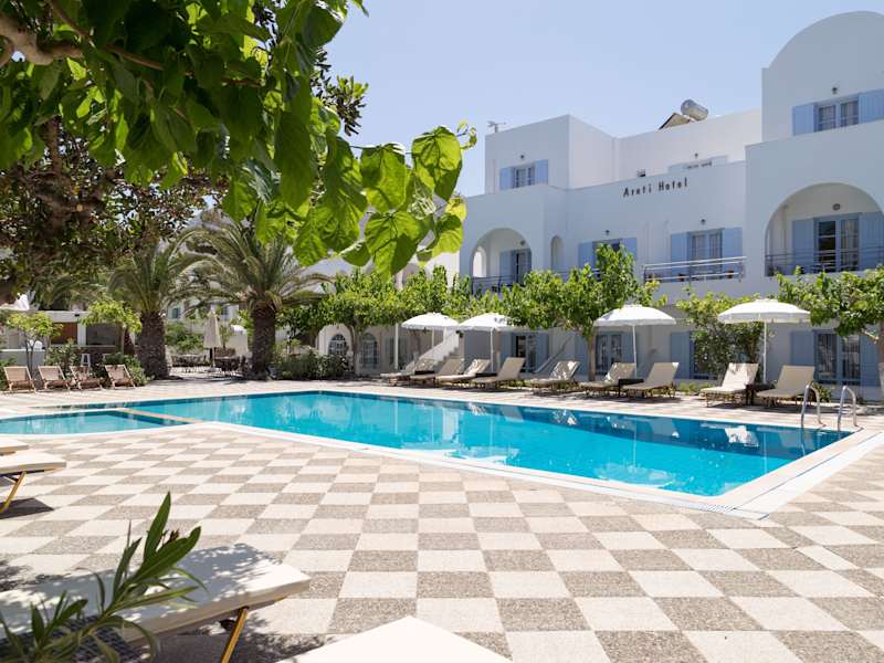 Das Hotel Areti bietet eine ruhige und autofreie Umgebung unterhalb des antiken Thira, ideal für entspannende Aufenthalte. Es verfügt über eine Gartenanlage, Dachterrasse und Sonnenterrasse sowie einen Pool, der von Mai bis Oktober geöffnet ist. Die Anlage besteht aus zwei Gebäuden und umfasst insgesamt 22 Zimmer.