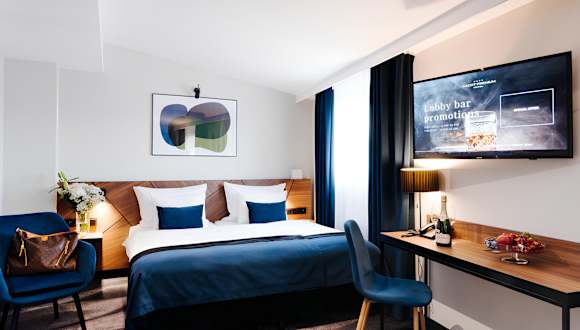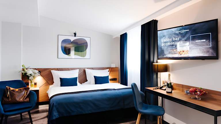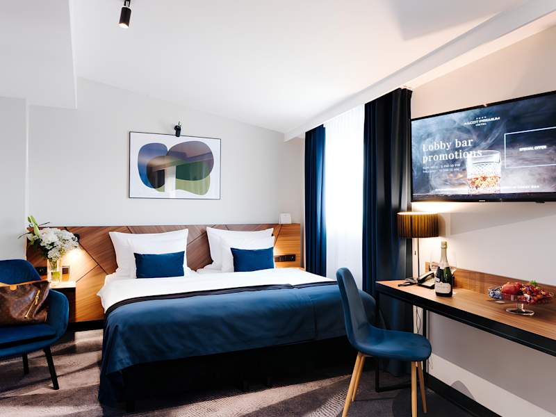 Die Zimmer sind klimatisiert und individuell beheizbar, ausgestattet mit Teppichboden, Minibar, Safe und einem Schreibtisch. Zur Grundausstattung gehören ein Telefon mit Direktwahl, ein TV-Gerät, ein Radio sowie kostenloses WLAN. Die Badezimmer sind mit Dusche und Badewanne ausgestattet und es sind rollstuhlgerechte Zimmer verfügbar.