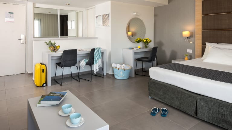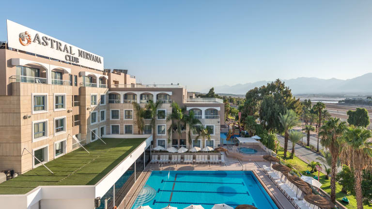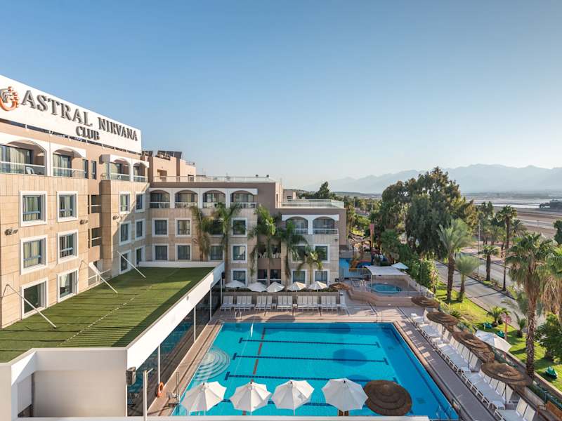 Das Hotel Astral Nirvana Club in Eilat ist der ideale Ort für einen entspannten und unterhaltsamen Urlaub. Es liegt im Stadtzentrum, umgeben von Geschäften und dem Nachtleben, und ist nur einen kurzen Spaziergang vom Nordstrand entfernt. Das Hotel bietet modern eingerichtete Zimmer mit Stadtblick, einen großen Außenpool mit Wasserrutschen und ein All-Inclusive-Verpflegungsangebot. Genießen Sie Ihr Frühstück und Abendessen im Restaurant mit Blick auf den Pool und entspannen Sie auf der Sonnenterrasse.