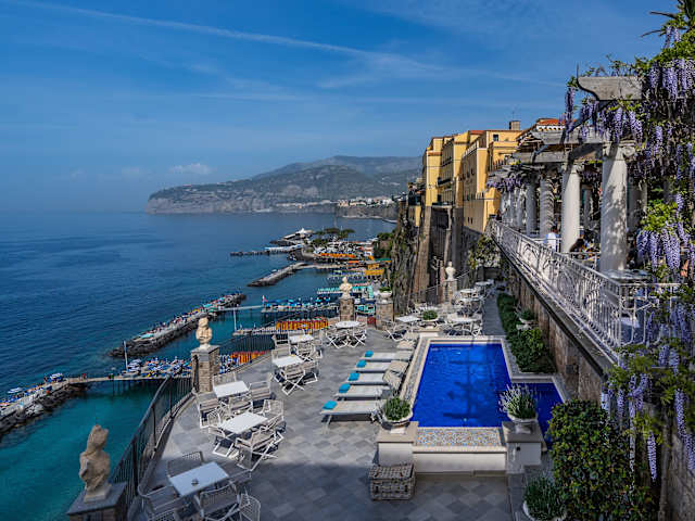 Das Hotel Bellevue Syrene liegt direkt am Strand und bietet eine zentrale Lage in Sorrent. Von hier aus haben Sie einen herrlichen Blick auf das Mittelmeer. Die Umgebung bietet zahlreiche Möglichkeiten zur Erkundung, darunter das historische Zentrum von Sorrento und die beeindruckenden Sehenswürdigkeiten der Region. Der Bahnhof Circumvesuviana ist nur einen kurzen Spaziergang entfernt, von wo aus Sie bequem die Küste entlang nach Positano oder mit dem Zug nach Pompeji oder Neapel gelangen können.