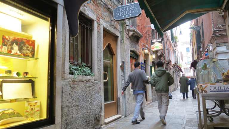 Das Bridge Hotel befindet sich in einer der typisch venezianischen Straßen, nur 2 Gehminuten vom Markusplatz und 10 Gehminuten von der Rialtobrücke entfernt. Die Lage des Hotels ermöglicht es Ihnen, die Sehenswürdigkeiten von Venedig bequem zu Fuß zu erkunden. In der Umgebung finden Sie auch zahlreiche Restaurants, Cafés und Geschäfte.