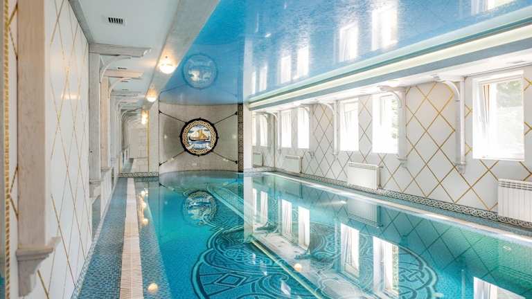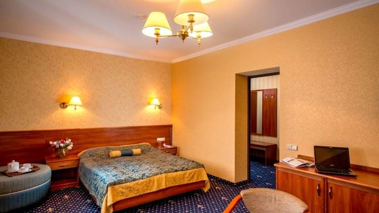 Das Buhta Vikingiv Hotel in Vodniki bietet seinen Gästen eine idyllische Umgebung mit drei Seen, einem Privatstrand, einem Reitstall und einem Wellnessbereich. Die schallisolierten Zimmer, Suiten und Apartments sind ideal für Familien geeignet und verfügen über einen Balkon und einen Fernseher. Das Hotel bietet eine Vielzahl von Aktivitäten wie Tennis, Angeln und Skifahren sowie Einrichtungen wie einen Spielplatz, einen Kinderclub, eine Sauna und eine Massage-Lounge. Das Hotel bietet auch einen Fitnessbereich und einen Fahrradverleih. Beginnen Sie Ihren Tag mit einem kontinentalen Frühstück und genießen Sie traditionelle ukrainische Spezialitäten im klassisch eingerichteten Restaurant des Hotels.