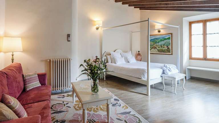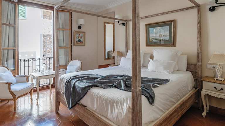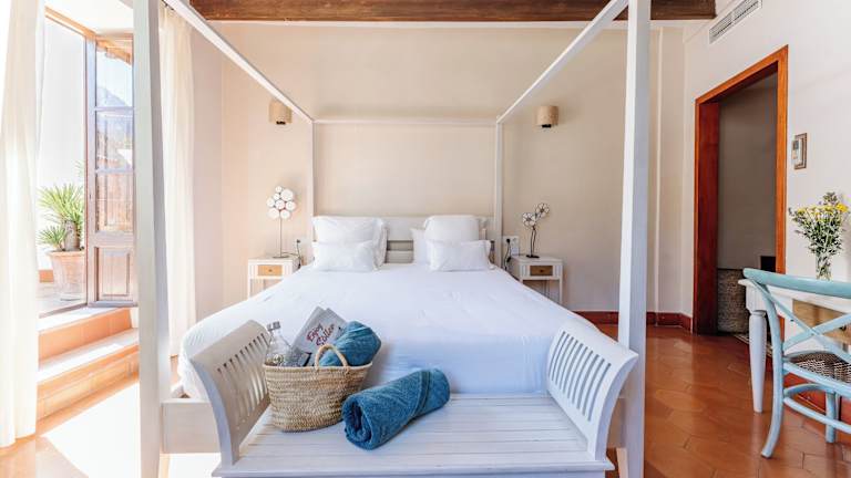 Die Zimmer im Hotel Ca'n Abril sind individuell gestaltet und bieten einen charmanten mallorquinischen Stil. Jedes Zimmer verfügt über einen Balkon, auf dem Sie die frische Luft und die Aussicht genießen können. Zur Ausstattung gehören ein Flachbild-Sat-TV, kostenloses WLAN und sogar kostenloses Netflix für gemütliche Abende. Die geräumigen Zimmer verfügen über ein eigenes Bad mit Pflegeprodukten, einem Bademantel und einem Haartrockner. Sie kombinieren historischen Charme mit modernen Details und sind klimatisiert, um Ihnen einen angenehmen Aufenthalt zu bieten.