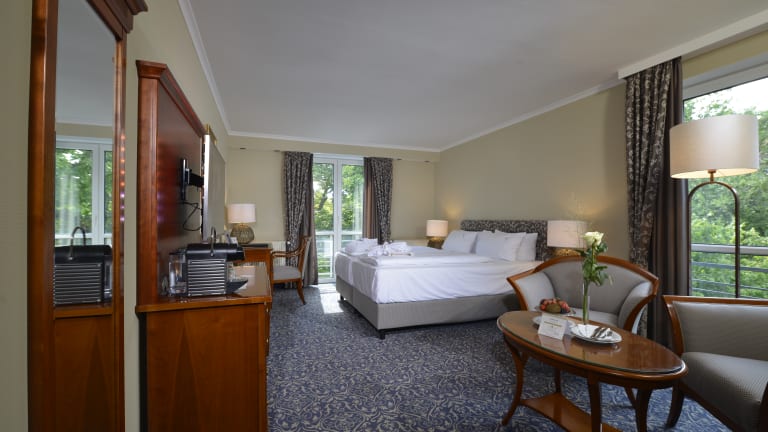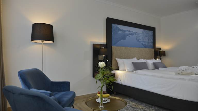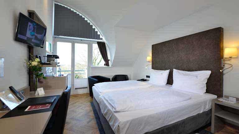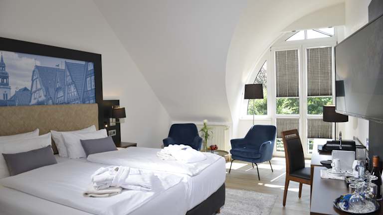 Alle Zimmer sind sehr individuell; nahezu jedes hat einen anderen Grundriss und spiegelt so die Persönlichkeit unseres Hauses im modernen Villenstil wieder. Treffen Sie Ihre persönliche Wahl aus drei Zimmerkategorien: Wohlfühl-Komfort: diese Zimmer wurden im November 2011 renoviert und hochwertig ausgestattet u.a. mit AloeVera Matrazen die eine Auflagenhöhe von 30 cm aufweisen. Für den Kaffeegenuss für "zwischendurch" sorgt ein Nespresso Kaffeeautomat. Die sanierten Badezimmer verfügen über großzügige Duschen mit einer Glasabtrennung. Wohlfühl: diese harmonisch eingerichteten Zimmer sind in einem warmen Farbton gestrichen und mit entsprechenden Stoffen und Teppichböden ausgestattet und verfügen teilweise über einen Balkon. Business: Diese ZImmer befinden sich Im "Haus am Brunnen", hier befindet sich auch die Rezeption und in diesem Gebäude servieren wir Ihnen auch ein ausgewogenes Frühstück. Diese Zimmer sind in einem komfortablen Businessstil eingerichtet. Die Badezimmer sind hier im modernen und doch klassischem weiß und schwarz neu gestaltet worden. Alle Zimmer im Hotel Caroline Mathilde sind mit Bad/Dusche, WC, Haartrockner, Telefon und SAT TV sowie Minibar ausgestattet. Außerdem bieten wir Ihnen für einen entspannten Fernsehabend kostenfrei einen privaten Sport- und einen Filmkanal. Unser Haus verfügt außerdem in der Business-Kategorie über zwei seniorengerechte, zwei Allergiker- und über vier speziell ausgewiesene Raucherzimmer. Als Geheimtipp gelten bei unseren Gästen die etwas kleineren aber mit viel Licht durchfluteten "Rundbogenzimmer". Hier können Sie sogar beim Duschen einen Blick in den Garten werfen... Als ein besonderes Zimmer haben wir für Sie unser "Caroline Mathilde" Zimmer in Erinnerung an den 250 jährigen Geburtstag der Namensgeberin unseres Hauses, der ehemaligen dänischen Königin Caroline Mathilde eingerichtet. Edle Stilmöbel und die Lieblingsfarbe 'Grün' ihrer Majestät finden sich in diesem Zimmer ebenso wieder, wie die warmen Farben in den dichten Vorhangstoffen und in der gemütlichen Sitzecke.