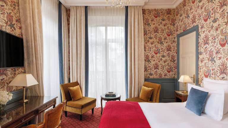 Die Zimmer im Hotel Le Castel Marie Louise verfügen über ein gemütliches Doppelbett, einen Safe, eine Minibar und einen Schreibtisch. Ein Minikühlschrank ist ebenfalls vorhanden. Zur Ausstattung gehören auch ein Telefon, ein Fernseher mit Kabelempfang und Pay-per-View-Option sowie kostenfreies WLAN. Das Badezimmer ist mit einer Dusche und einer Badewanne sowie einem Haartrockner ausgestattet. Rollstuhlgerechte Zimmer mit barrierefreiem Badezimmer sind ebenfalls verfügbar.