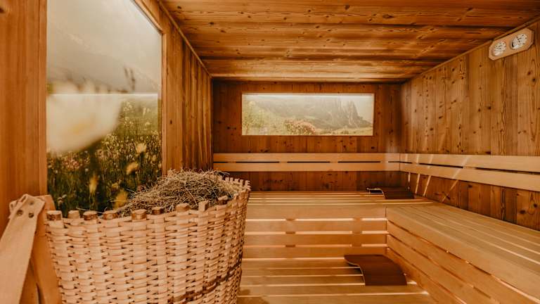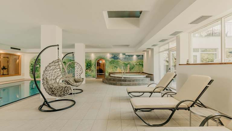 Neue Wellnessanlage mit finnischer Stubensauna, Dampfbad, Bio-Heusauna, org. "Luis Trenker"- Infrarotkabine, Hot-Whirl-Pool, Schwimmbad mit Ausblick auf den Schlern. Massage- Kosmetikangebote, traditionelles Heubad - Genießen Panorma-Dachterrasse mit Whirlpool, Sonnenliegen, Kneipbecken. Große Liegewiese und Genuss-Schaukel in unserem grünen Garten.