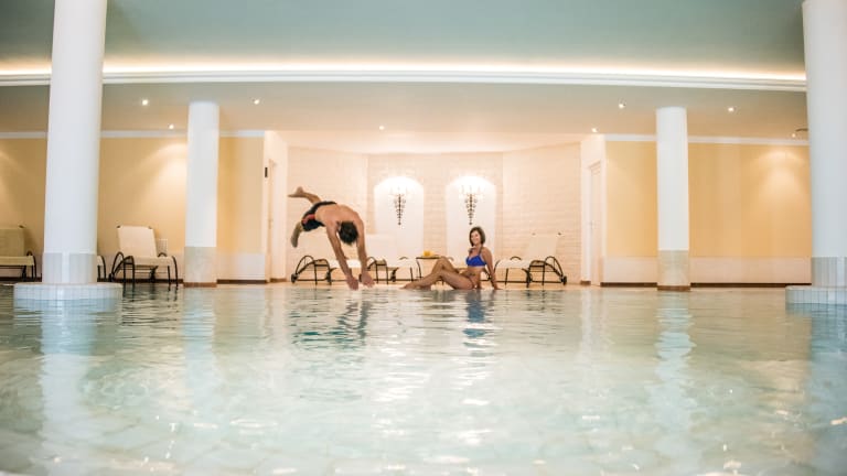 Schwimmbad 15m mit Liegewiese, Finnische Sauna, Infrarotsauna, Dolomitensauna, Lärchen-Textilsauna, Dampfbad - Nutzung kostenlos. Neuer Panorama TechnoGym-Fitnessraum. Private Whrilwannen gegen Bezahlung, Spielraum für Erwachsene mit Darts, Billard, Tischfußball und 10m Luftgewehrschießstand. Kinderspielraum mit Billard, Videogames, Tischfußball, im Sommer Spielplatz im Freien.