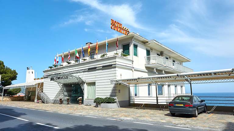 Meer, Sonne und die Blumenriviera 365 Tagen im Jahr. Wie auf einem Schiff: das Blau des Meeres ist überall. Ob Sie im Kräutergarten spazieren gehen, in den Meetingroom Panorama eintreten. Zum Solarium aufsteigen, sich ins Restaurant Lorenzina Mare setzen, oder es sich in der Hall oder im Zimmer bequem machen. Eine einzigartige Lage. Wir befinden uns direkt über dem Meeresrand, vor den Sandstränden und dem“Fadder Verliebten weniger Schritte vom malerischen Borgo Parasio mit seinen zauberhaften Winkeln und Sonnenuntergängen. Das Hotel Corallo ist ein Ort, wo es einem Gut ergeht. Suggestiv und elegant gemacht für ein romantisches Wochenende, Ferien, eine Arbeits- oder gastronomische Reise. Zu uns zu kommen, ist immer eine gute Idee.