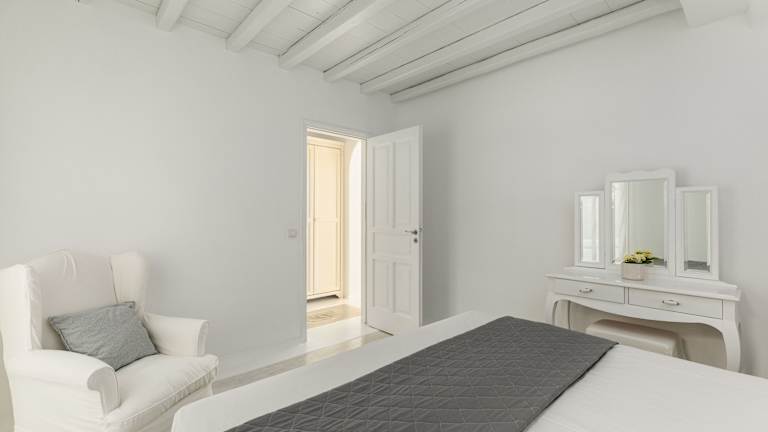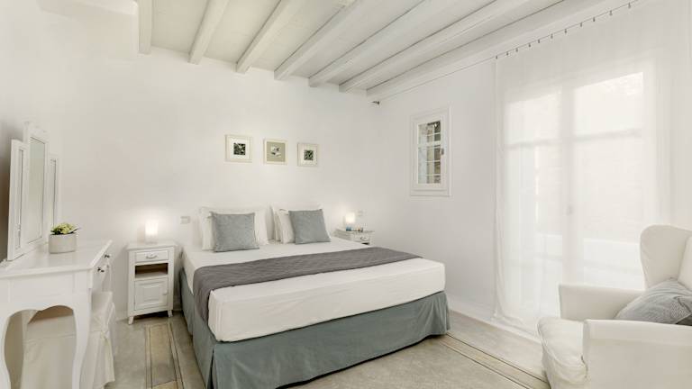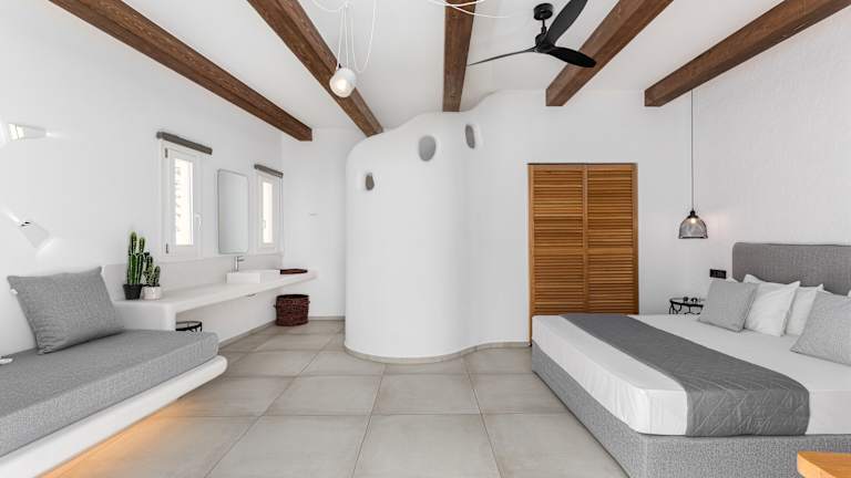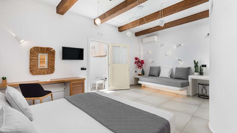 Die Zimmer im Corfos Hotel sind im typischen Kykladen-Stil gestaltet und bieten ein minimalistisches Dekor mit hellblauem und weißem Mobiliar. Die Zimmer sind klimatisiert und verfügen über Annehmlichkeiten wie Sat-TV und einen Kühlschrank. Das kostenfreie WLAN ist in allen Zimmern verfügbar.
