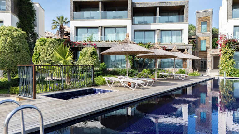 Das Costa Farilya Special Class Hotel Bodrum ist ein traumhaftes Hotel, das direkt am Strand gelegen ist und mit einem privaten Strandbereich aufwartet. Der grüne Garten rund um das Hotel lädt zum Entspannen ein. Genießen Sie die Annehmlichkeiten wie den Massageservice und das kostenfreie WLAN. Die modern eingerichteten Zimmer bieten Ihnen eine Klimaanlage und einen Fernseher. Einige Zimmer verfügen zudem über einen eigenen Balkon mit Meerblick. Im hoteleigenen Restaurant können Sie frische Spezialitäten aus der Region Bodrum sowie Gerichte aus dem Steinofen und der Ägäis genießen. Starten Sie Ihren Tag mit einem traditionellen türkischen Frühstück. Die Umgebung bietet zahlreiche Sehenswürdigkeiten wie den Yachthafen und das Kastell von Bodrum. Das Stadtzentrum von Bodrum erreichen Sie bequem mit dem Auto in nur 20 Minuten. Der internationale Flughafen Bodrum-Milas ist nur 30 Fahrminuten vom Hotel entfernt.