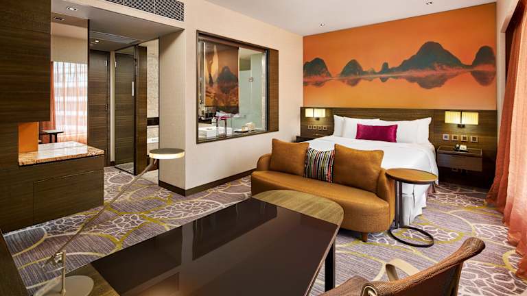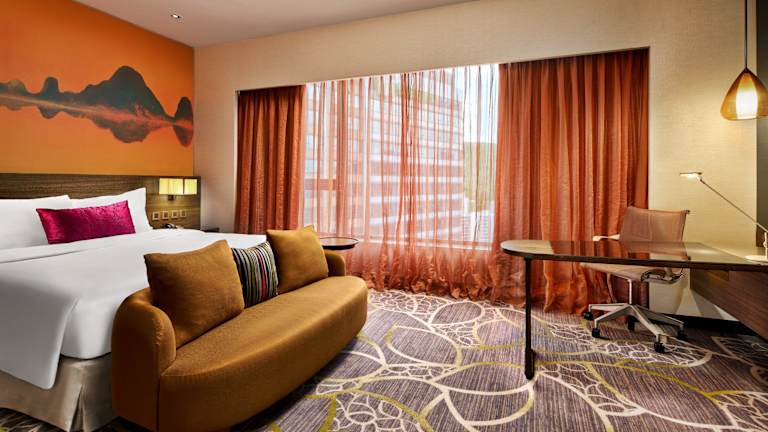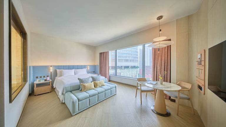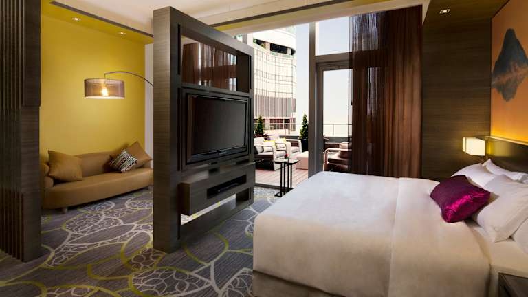 Das Hotel bietet 359 luxuriöse und moderne Zimmer auf 47 Etagen. Jedes Zimmer verfügt über Annehmlichkeiten wie einen Flachbild-Kabel-TV, eine Minibar, einen Safe und kostenfreie Pflegeprodukte im eigenen Badezimmer. Ein Bügeleisen und ein Bügelbrett sind ebenfalls vorhanden, um Ihren Aufenthalt so bequem wie möglich zu gestalten.