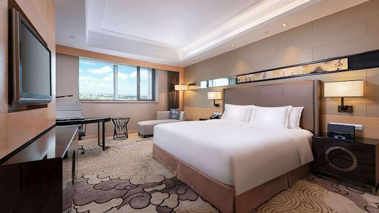 Die Zimmer im Crowne Plaza Xi'an sind elegant eingerichtet und bieten einen Blick auf die Skyline der Stadt. Sie sind klimatisiert und verfügen über kostenloses WLAN sowie einen 24-Stunden-Zimmerservice. Die Zimmer sind mit dunklen Holzmöbeln und Teppichböden ausgestattet und verfügen über einen Flachbild-TV, eine Minibar, einen begehbaren Kleiderschrank und Bügeleinrichtungen. Die privaten Badezimmer sind mit einer Badewanne und einem Haartrockner ausgestattet.
