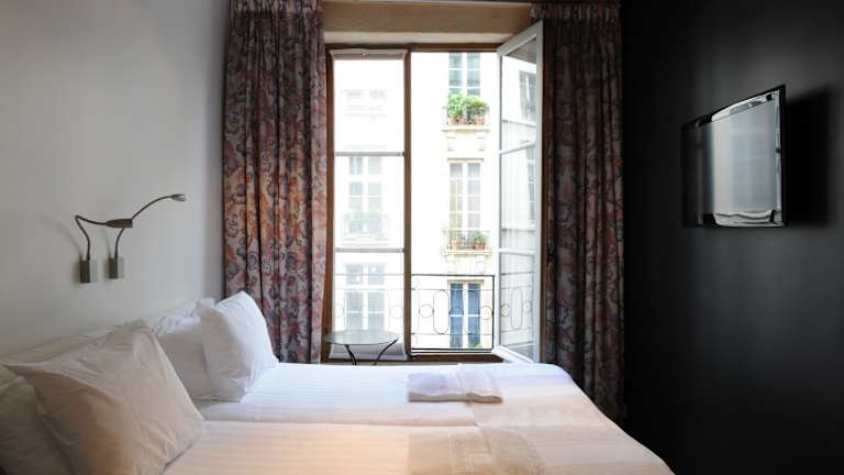 Die Zimmer im Boutique-Hotel de la Place des Vosges sind modern und komfortabel eingerichtet. Sie verbinden stilvolles Design mit historischen Elementen wie freiliegenden Balken und Steinwänden aus dem 16. Jahrhundert. Jedes Zimmer verfügt über einen Flachbild-TV und bietet einen gemütlichen Rückzugsort nach einem ereignisreichen Tag in Paris.