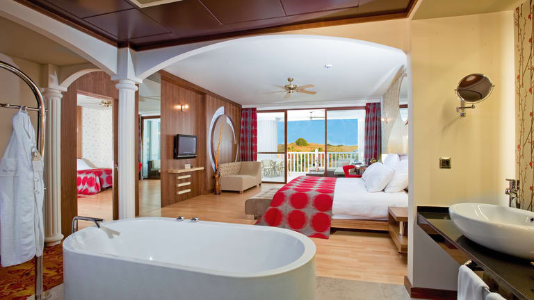 Deluxe Suite (ca. 80 m2 Inklusive Terrasse): Die modernen, luxuriös und geschmackvoll eingerichteten Zimmer verfügen über viele Annehmlichkeiten für einen erholsamen Aufenthalt: extra große Doppelbetten (Kingsize Bett Breite 220cm x 200cm mit getrennten Matratzen), Terrasse (ca. 20 m2), Laminatfußboden, Dusche/WC, Föhn, Sitzecke, Direktwahltelefon, Rauchmelder, Safe, SAT-LCD-TV mit Musikkanal (mehrere deutsche Programme verfügbar), Klimaanlage (zentral gesteuert, stundenweise, wetterabhängig), separater Ankleideraum, Minikühlschrank (mit Wasser aufgefüllt). Zimmer mit Poolblick sind gegen Aufpreis buchbar. EZ = DZ zur Alleinbenutzung zur Gartenseite. Sunset Suite (ca. 160 m2 Inklusive Terrasse): Die modern, luxuriös und geschmackvoll eingerichteten Zimmer sind mit großen Terrasse (ca. 40 m2), extra große Doppelbetten (King size Bett Breite 220cm x 200cm mit getrennten Matratzen), Badewanne/Dusche/WC, Laminatfußboden, Föhn, Sitzecke, Direktwahltelefon, SAT-LCD-TV mit Musikkanal (mehrere deutsche Programme verfügbar), Klimaanlage (zentral gesteuert, stundenweise, wetterabhängig), separatem Ankleideraum, Minikühlschrank (mit Wasser aufgefüllt), Safe. Summertime Familiensuite (ca. 160 m2 Inklusive Terrasse): Moderne, luxuriös und geschmackvoll eingerichtete Zimmer, bestehend aus zwei Schlafräumen, die durch eine Schiebetür getrennt sind. Ein Raum ist mit Doppelbett und Badewanne/Dusche/WC ausgestattet, ein Raum mit zwei Einzelbetten und Dusche/WC. Die Zimmer sind mit Laminatfußboden, Sitzgarnitur, extra große Doppelbetten (Kingsize Bett Breite 220cm x 200cm mit getrennten Matratzen), Terrasse (ca. 40 m2), Föhn, Sitzecke, Direktwahltelefon, SAT-LCD-TV mit Musikkanal (mehrere deutsche Programme verfügbar), Klimaanlage (zentral gesteuert, stundenweise, wetterabhängig), separatem Ankleideraum, Minikühlschrank (mit Wasser aufgefüllt), Safe. Die Zimmerreinigung erfolgt sechs Tage in der Woche. Sie erhalten pro Person und Woche 2 Badetücher, 2 Handtücher und 2 Strandtücher. Die Bettwäsche wird einmal in der Woche gewechselt. Wäscherei-Service (gegen Gebühr). Bitte beachten Sie, dass alle Zimmer Nichtraucherzimmer sind. Die Zimmer sind mit Rauchmeldern ausgestattet.