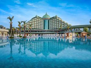 Leistungen die im Ultra All Inclusive Preis enthalten sind Offenes Buffet; Frühstück, Spätfrühstück, Mittagessen, Abendessen, Mitternachtssnack im Palm Sport & Snack Pub), 7 a la carte Restaurants sind pro Aufenthalt 1 mal kostenlos (Reservierung erforderlich), Lokale alkoholische und alkoholfreie Getränke sowie einige importierte (Lobby Bar, Joia Bar & Disco), Die Minibar wird täglich mit Bier, Cola, Fanta, Ice Tea, Mineralwasser, Wasser, Fruchtsaft, Schokolade, Cracker, Chips aufgefüllt, Safe im Zimmer, 2 Tennisplätze, Ausrüstung und Beleuchtung (mit Reservierung und gegen Kaution), Türkischer Hamam, Sauna, Dampfbad, Fitness Center, Aerobic, Wassergymnastik, Gymnastik, Tischtennis, Step, Kino, Die Nutzung des Relaxpools ist für Gäste unter 15 Jahren untersagt (in der Hochsaison), Hallenbad und Whirlpool, Haupt Pool, Kinder Pool, Pool mit Rutschen, Relax Pool, Die Öffnungszeiten der Pools können sich ändern und sind wetterabhängig, Sonnenschirme, Liegen, Auflagen, Badetücher (wetterbedingt), Tagsüber Sportturniere und Poolspiele, am Abend Revueshows, Sketch – und Animationsshow, Gelegentlich Live Musik und Disko, Im Zimmer und Lobby WiFi, Lunapark Offener Parkplatz. Leistungen die nicht im Ultra All Inclusive Preis enthalten sind Telefon, Fax, Friseur, Game Room, Billard, Bowling, Tischfussball, Computerspiele, Kosmetiksalon, Kleopatra Milchbad, Jacuzzi in Spa, diverse Massagearten, Peeling mit „Anti Stress’’Anwendungen, Internet Cafe, Wäscherei – und Bügelservice, Gesundheitsdienst und Arzt (zwischenzeitlich), 24 Stunden Zimmerservice Motorisierte und nicht motorisierte Wassersportarten Notizen: In den Restaurants und Bars werden die Getränke an die Tische serviert, kann auch von den Gästen selbst genommen werden. Für die Gäste unter 18 Jahren werden keine alkoholischen Getränke ausgeschenkt. Alkoholische Getränke werden nicht in Flaschen und nicht beim Frühstück serviert. Das Tragen eines Plastikarmbandes ist erforderlich. Es sind keine Haustiere gestattet. Am Pier sowie in allen Ausseneinrichtungen wird wetterabhängig Service geleistet. Die Ausleihe von Rollstuhl und Babywagen sind an der Rezeption auf Anfrage gegen Kaution möglich. Kreditkarten: Visa und Master Card