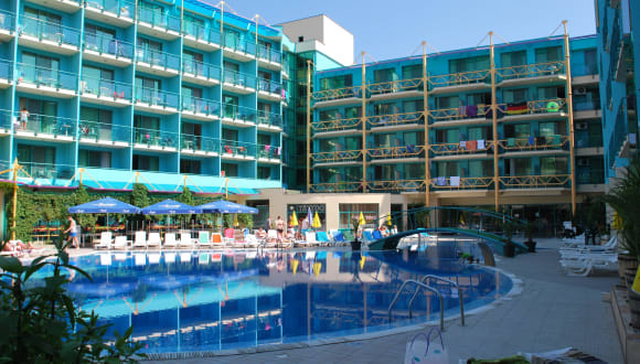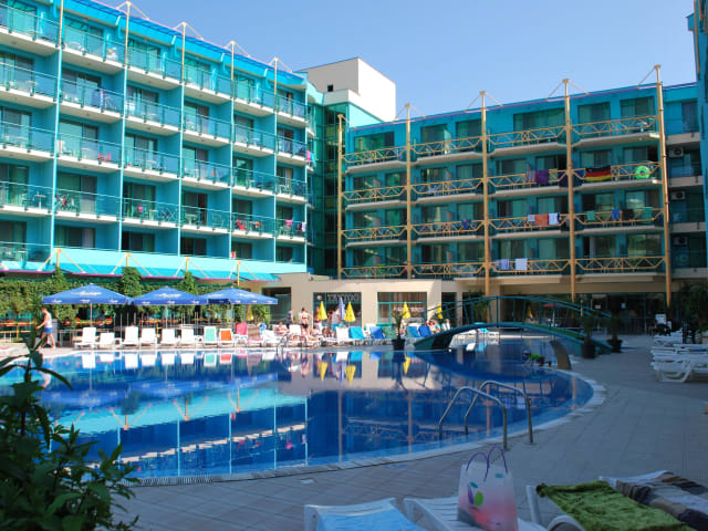 In zentraler Lage in Sonnenstrand liegt das Diamond Hotel, nur 250 m vom Meer entfernt. Hier fühlen sich besonders Familien und junge Gäste wohl, da zahlreiche Unterhaltungsmöglichkeiten in der Nähe liegen. Das Hotel Diamond verfügt über einen großzügigen Rezeptionsbereich, eine Lobbybar, ein Buffet-Restaurant mit offener Terrasse und eine ganz neue Snackbar. Freuen Sie sich auf gelegentliche Show-Koch-Einlagen und Themenabende zur Dinnerzeit. Die Aussenanlagen wurden im Jahr 2019 komplett renoviert und sind sehr hell und modern eingerichtet. Im Bereich des großen Außenpools finden Sie einen speziellen Bereich für Kinder sowie eine hübsche Poolbar. Die Liegen und Sonnenschirme am Pool nutzen Sie kostenlos.