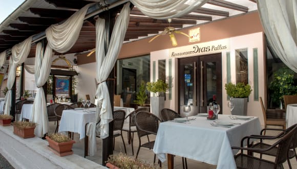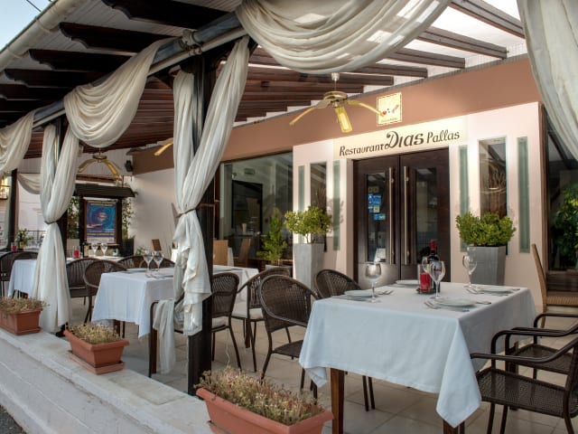 Unser Restaurant "Dias Pallas" ist ausgezeichnet mit der Auszeichnung "Griechische Kueche" Diese Auszeichnung ist fuer Verwendung von absolut frischen Produkten, sowie hochwertigen Produkten der Griechischen Erde. Geniessen Sie Ihr Fruehstueck auf der Terrasse oder im Restaurant. Neben Produkten aus eigenem Anbau, bekommen Sie auch BIO Produkte, besten Honig, hausgemachte Marmeladen, frischgepressten Saft und vieles mehr. Abend koennen unsere Halbpensions Gaeste zwischen 2 Gang Menues waehlen, wobei auch kombiniert werden kann. alle Speisen werden a la minute zubereitet. Waehlen Sie einen Wein aus unserer sehr spezialisierten Weinkarte.