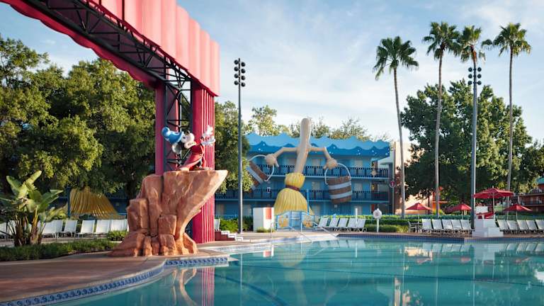 Hotel Disney's All Star Movies Resort ist ein Nichtraucherhotel mit 1920 Zimmern, das durch seine bunten Filmlandschaften und überdimensionale Bilder besticht. Die Rezeption ist rund um die Uhr besetzt, Geldwechsel und Hotelsafe sind ebenfalls verfügbar. Der Check-in erfolgt ab 15:00 Uhr, der Check-out bis 11:00 Uhr. Das Hotel bietet zudem einen Outdoor-Pool sowie eine Ladenzeile und einen Souvenirshop. Internetzugang über WLAN ist in der gesamten Anlage kostenfrei.