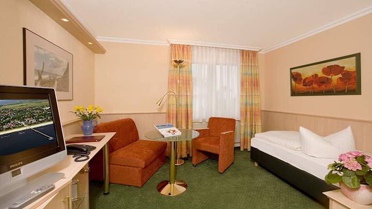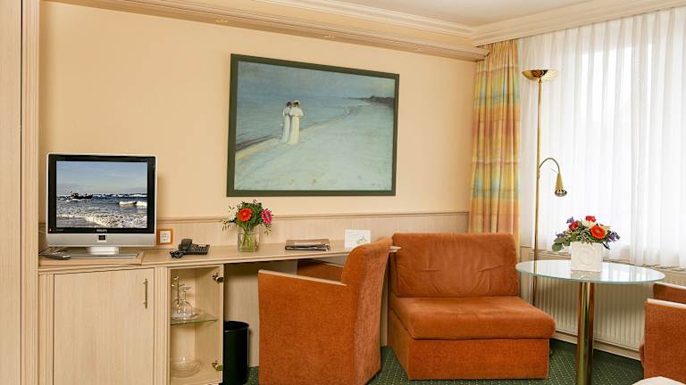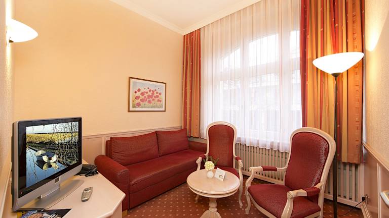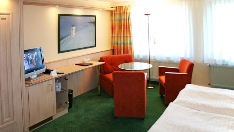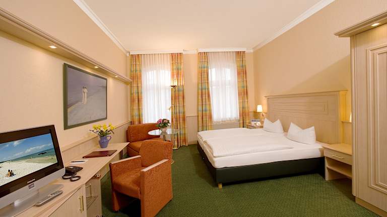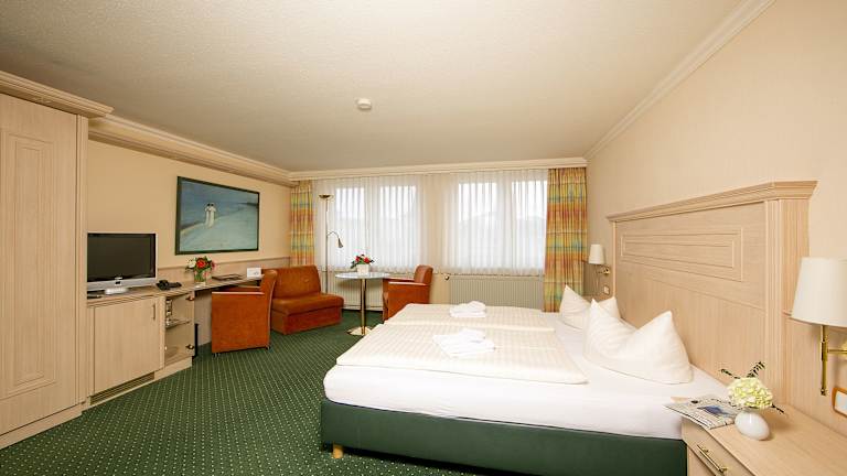 Die Zimmer im Hotel Dünenschloss sind komfortabel und gemütlich eingerichtet. Nach einer erholsamen Nacht können Sie sich am köstlichen Frühstücksbuffet stärken und gestärkt in den Tag starten.