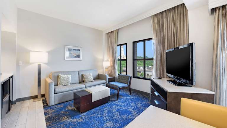 Die geräumigen Suiten im Embassy Suites by Hilton Alexandria Old Town bieten den Gästen viel Platz und Komfort. Jede Suite verfügt über einen separaten Wohnbereich, eine voll ausgestattete Küche und ein Badezimmer. Zur Ausstattung gehören auch ein Schreibtisch, ein Flachbildfernseher, WLAN und ein Bügelset.