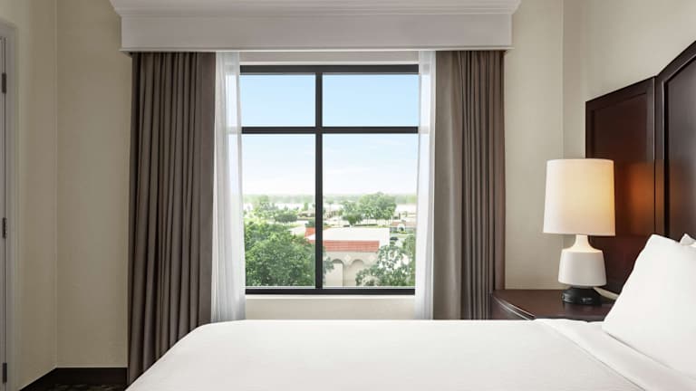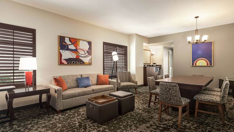 Das Hotel Embassy Suites by Hilton Orlando Lake Buena Vista South bietet 300 Zimmer auf 11 Etagen. Die Zimmer sind modern eingerichtet und verfügen über Annehmlichkeiten wie einen Wohnbereich, Klimaanlage, einen Flachbild-TV, einen Safe, einen Schreibtisch, eine Mikrowelle, einen kleinen Kühlschrank, eine Kaffeemaschine und WLAN. Es gibt auch rollstuhlgerechte Zimmer mit barrierefreiem Badezimmer.