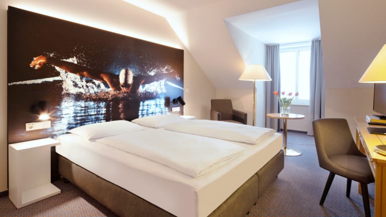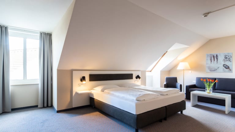 45 Einzel- & 48 Doppelzimmer Zimmer-Kategorien: - Einzelzimmer Komfort/Superior Die freundlichen Einzelzimmer sind mit Klimaanlage, schallisolierten Fenstern, WLAN, Direktwahltelefon, TV und einer Minibar ausgestattet. Das helle Bad verfügt über einen großen Spiegel, Haartrockner, Dusche, WC und eine geräumige Ablage. Die Zimmer der Komfort-Kategorie sind zur Straße hin ausgerichtet. Die Superior-Zimmer liegen zur ruhigeren Rückseite des Hotels. Größe der Betten: Breite: 90 - 160 cm Länge: 200 cm - Komfort/Superior-Doppelzimmer Die freundlichen Doppelzimmer sind mit Klimaanlage, schallisolierten Fenstern, WLAN, Direktwahltelefon, TV und einer Minibar ausgestattet. Das helle Badezimmer verfügt über einen großen Spiegel, Haartrockner, Dusche, WC und eine geräumige Ablage. Die Zimmer der Komfort-Kategorie sind zur Straße hin ausgerichtet. Die Superior-Zimmer liegen zur ruhigeren Rückseite des Hotels. Größe der Betten: Breite: 180 - 200 cm Länge: 200 cm - Zweibettzimmer Die freundlichen Zweibettzimmer sind mit Klimaanlage, schallisolierten Fenstern, WLAN, Direktwahltelefon, TV und einer Minibar ausgestattet. Das helle Badezimmer verfügt über einen großen Spiegel, Haartrockner, Dusche, WC und reichlich Ablagemöglichkeiten. Die Zimmer mit zwei getrennten Betten liegen zur Straße hin. Größe der Betten: Breite: 140 cm Länge: 200 cm - Komfort/Superior Dreibettzimmer Die geräumigen Dreibettzimmer sind mit Klimaanlage, schallisolierten Fenstern, WLAN, Direktwahltelefon, TV und einer Minibar ausgestattet. Das helle Badezimmer verfügt über einen großen Spiegel, Haartrockner, Dusche, WC und viel Ablagefläche. Die Zimmer der Komfort-Kategorie sind zur Straße hin ausgerichtet. Die Superior-Zimmer liegen zur ruhigeren Rückseite des Hotels. Größe der Betten: Zimmervariante 1: Doppelbett + Einzelbett Breite: 180 cm (Doppelbett) | 90 (Einzelbett) Länge: 200 cm Zimmervariante 2: Doppelbett + Ausziehcouch Breite: 180 cm (Doppelbett) | 140 cm (Schlafcouch) Länge: 200 cm
