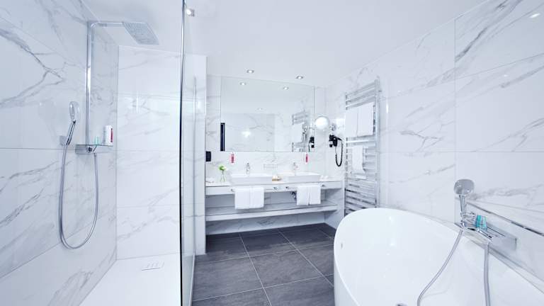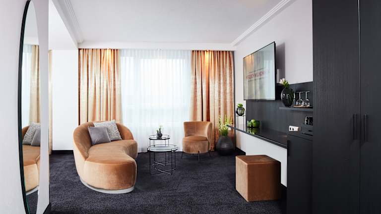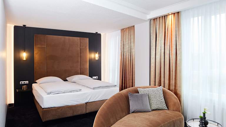 » Komfort-Doppelzimmer (ca. 26 m²) Die hellen Zimmer befinden sich zwischen der zweiten und fünften Etage mit komfortablem Doppelbett (1,80 m x 2,00 m, zwei getrennte Matratzen), zwei behaglichen Sesseln und geräumigem Badezimmer. » Superior-Doppelzimmer mit Terrasse (ca. 26 m²) Die neuen und modern eingerichteten Erdgeschosszimmer verfügen über einen direkten Zugang zur lichtdurchfluteten Außenterrasse inklusive gemütlicher Bestuhlung. Neben einem komfortables Doppelbett (zwei getrennte Matratzen), bieten alle 8 Zimmer dieser Kategorie die Möglichkeit der Kaffee- und Teezubereitung auf dem Zimmer. » Barrierefreie Zimmer (ca. 28 m²) Im Erdgeschoss stehen 4 elegante Zimmer mit moderner befahrbarer Dusche (samt Hocker), angepasster Waschtischhöhe, verschiedenen Haltegriffen, genügend Raum zum Wenden, einer rollstuhlgerechten Betthöhe, leicht erreichbaren Licht- und Notschaltern sowie direktem Terrassenzugang zur Verfügung. Ein barrierefreies Zimmer ist zusätzlich über eine Verbindungstür mit dem benachbarten Zimmer verbunden, beispielsweise für eine Begleitperson. » Superior-Doppelzimmer (ca. 30 m²) Die meisten der 16 Superior-Doppelzimmer auf den Etagen zwei bis fünf sind Eckzimmer und verfügen über eine große Fensterfront mit Aussicht über die Stadt Fulda. Schlafen Sie im komfortablen Eck-Doppelbett (1,80 m x 2,00 m, zwei getrennte Matratzen). » Deluxe-Doppelzimmer (ca. 30 m²) Eine Besonderheit stellen die 4 Deluxe-Doppelzimmer dar. Die neu gestalteten Zimmer auf den Etagen zwei bis fünf verfügen neben einer freistehenden Badewanne über einen kleinen Barbereich, eine helle und lichtdurchflutete Fensterfront samt gemütlicher Sitzecke sowie einer separaten Dusche im Bad. Schlafen Sie im komfortablen Doppelbett (1,80 m x 2,00 m, zwei getrennte Matratzen). » Junior-Suiten (ca. 35 m²) In der 5. Etage finden Sie, in herrlicher Lage mit Aussicht auf den Garten, die 8 luxuriösen Junior-Suiten im neuen Design. Schlafen Sie im komfortablen Doppelbett (1,80 m x 2,00 m, zwei getrennte Matratzen), entspannen Sie auf der bequemen Couch oder nutzen Sie die Möglichkeit der Kaffee- und Teezubereitung. Ein weiteres Highlight bildet das Badezimmer mit seinen zwei Waschbecken, der großen verglasten Dusche und der eleganten Badewanne. » Esperanto-Suiten (ca. 60 m²) Luxuriöse Suiten in der 6. Etage mit unvergleichbarem Blick über die Barockstadt Fulda. Die 6 Esperanto-Suiten erreichen Sie über einen separaten Zugang (Lift nur für diese Zimmerkategorie). Getrennter Wohn- und Schlafbereich, großzügiges Badezimmer mit zwei Waschbecken, separate Toilette mit Bidet, verglaste Dusche, Badewanne und LCD-Flachbildschirm im Wohn- und Schlafzimmer sprechen für sich. Schlafen Sie im komfortablen Doppelbett (1,80 m x 2,00 m, zwei getrennte Matratzen). » Ausstattung und Inklusivleistungen Alle 326 Nichtraucher-Zimmer verfügen über Minibar, Privat-Safe, Haartrockner, Bademantel und Frotteeslipper, Telefon, Flachbild-Fernseher und WLAN Internet-Zugang.