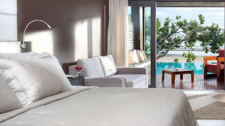 Die klimatisierten Zimmer sind stilvoll und modern eingerichtet. Sie verfügen über einen Flachbild-TV, Meerblick und einen direkten Zugang zum Außenpool. Die Zimmer sind mit einem modernen Badezimmer inklusive kostenfreier Pflegeprodukte ausgestattet.