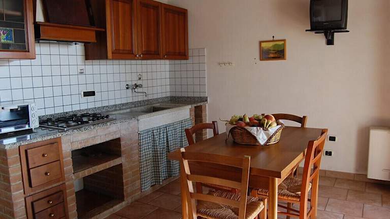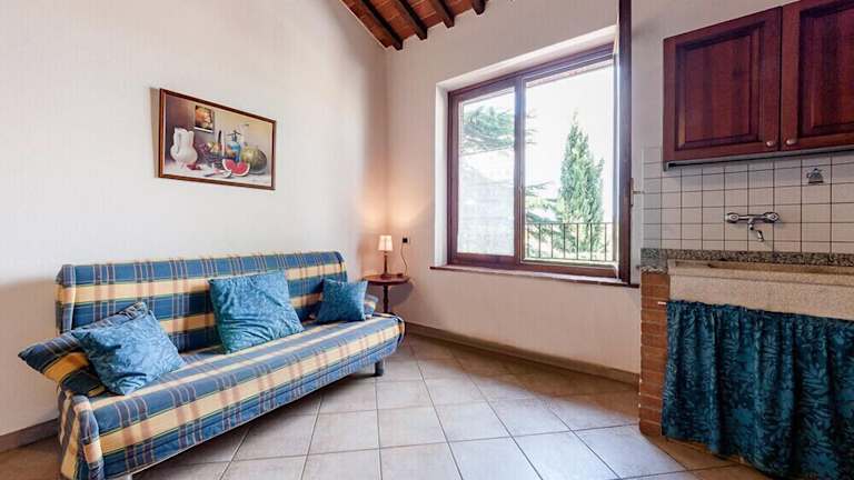 Die Apartments im Agriturismo La Fonte Di Vivalda sind komfortabel und geräumig. Jedes Zimmer ist im rustikalen Landhausstil eingerichtet und verfügt über eine große Küche und einen gemütlichen Sitzbereich mit einem Schlafsofa. Darüber hinaus bieten die Zimmer eine private Terrasse oder einen Gartenbereich mit einem Tisch und Stühlen, ideal zum Entspannen und Genießen der toskanischen Sonne.