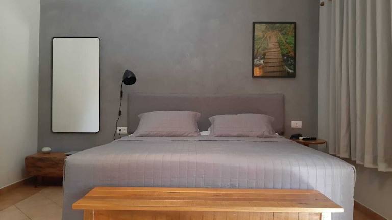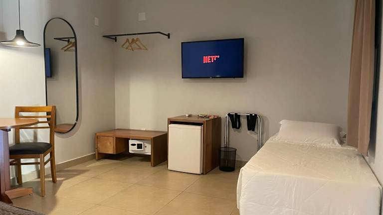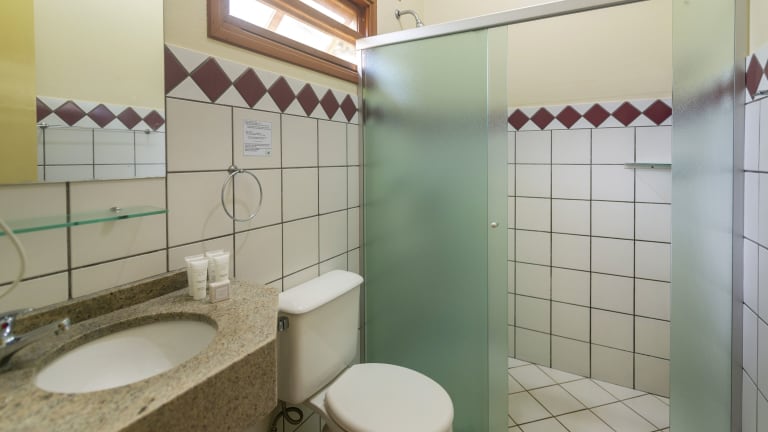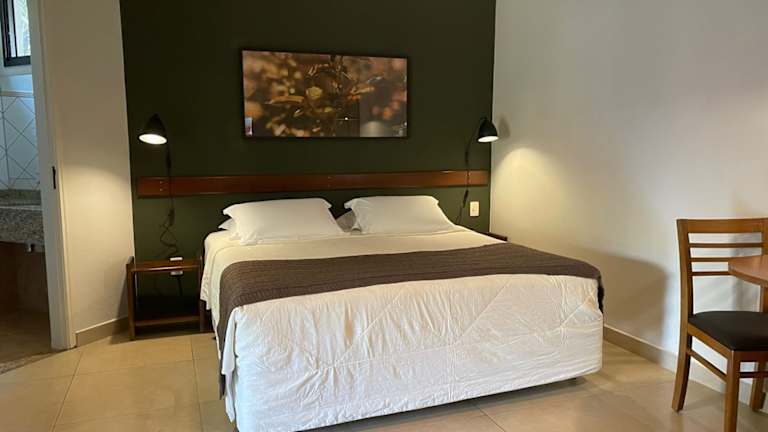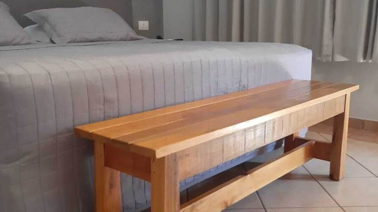 Die klimatisierten Zimmer des Hotel Fazenda Areia Que Canta verfügen über eine Minibar, ein Telefon und einen Flachbild-TV. Jedes Zimmer besitzt einen Balkon mit einer Hängematte und Blick auf den See.