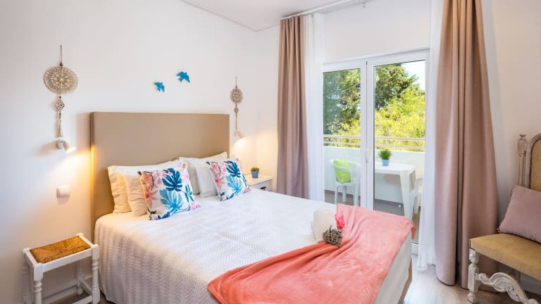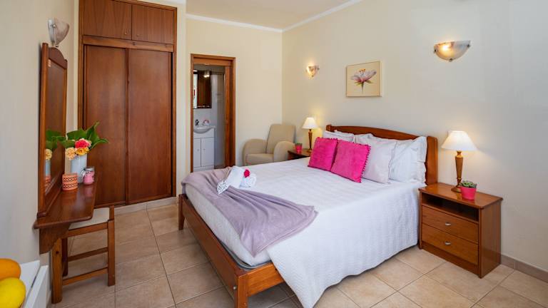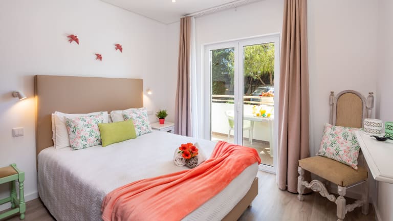 Die Apartments in den Apartamentos Flôr da Laranja sind geräumig und im Landhausstil eingerichtet. Jede Wohneinheit verfügt über eine voll ausgestattete Küche mit einem Esstisch, einer Sitzecke und einem TV. Ein Balkon gehört ebenfalls zur Ausstattung. Die Apartments sind klimatisiert und bieten den Gästen Komfort und Privatsphäre während ihres Aufenthalts.