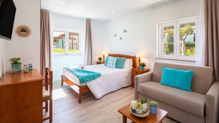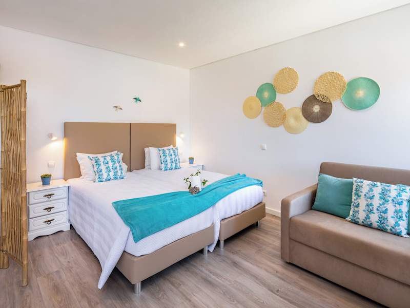 Die Apartamentos Flôr da Laranja verfügen über zwei Außenpools, in denen Sie sich an heißen Tagen abkühlen können. Es gibt auch Sonnenliegen am Pool, auf denen Sie sich entspannen können. Für die kleinen Gäste gibt es einen Spielplatz, auf dem sie sich austoben können. Die Umgebung bietet auch viele Möglichkeiten für Outdoor-Aktivitäten wie Radfahren und Reiten.