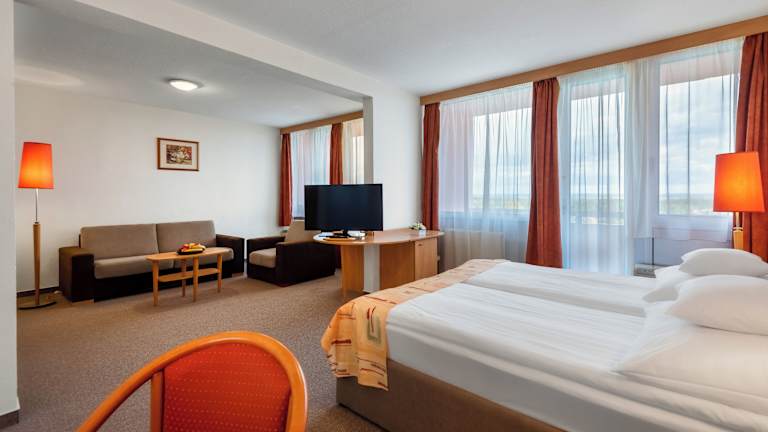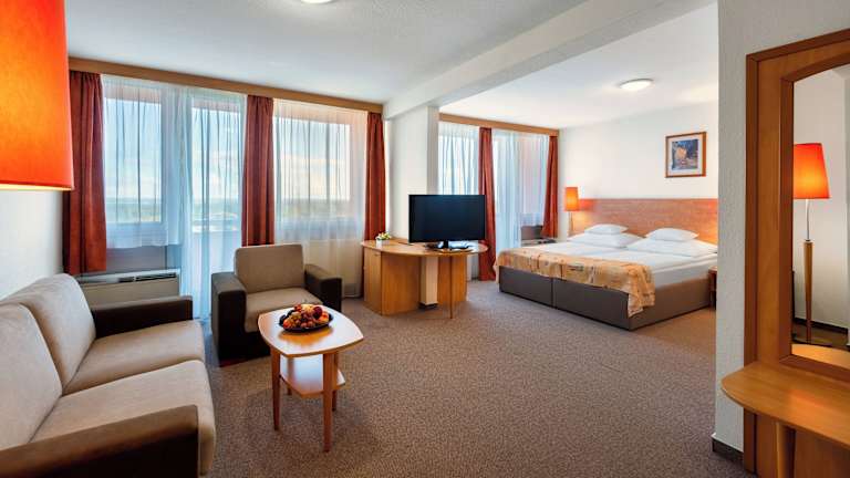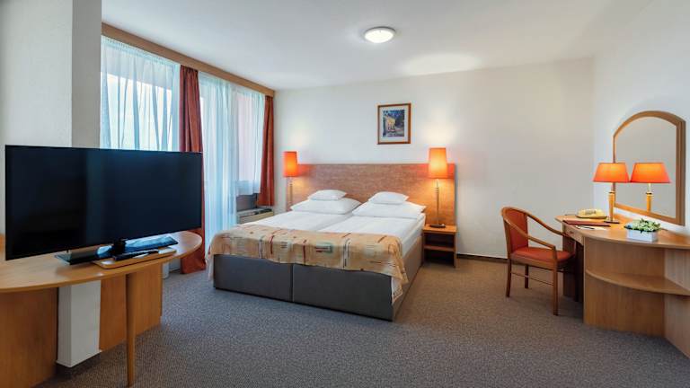 Das Hunguest Hotel Freya bietet komfortable Zimmer mit einer gemütlichen Atmosphäre. Jedes Zimmer verfügt über einen Balkon, auf dem Sie die frische Luft und die Aussicht auf den Park genießen können. Zur Ausstattung gehören auch eine Minibar und kostenfreies WLAN, damit Sie sich wie zu Hause fühlen können. Der Raum ist klimatisiert und verfügt über eine Heizung, um Ihnen zu jeder Jahreszeit Komfort zu bieten. Im Badezimmer finden Sie eine Dusche und eine Whirlwanne sowie Bademäntel für Ihre Bequemlichkeit.