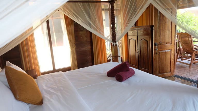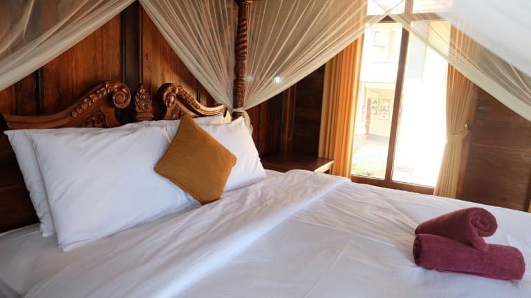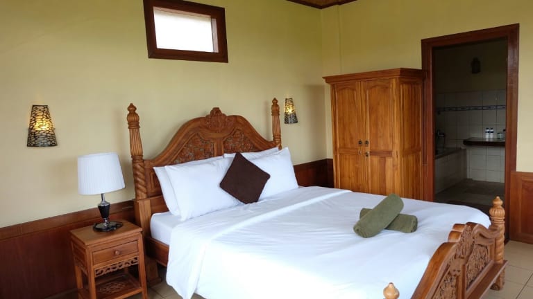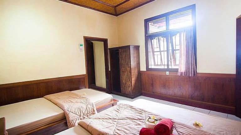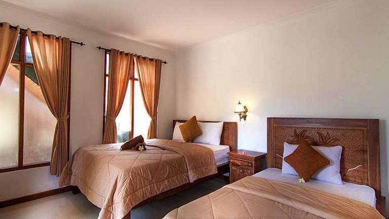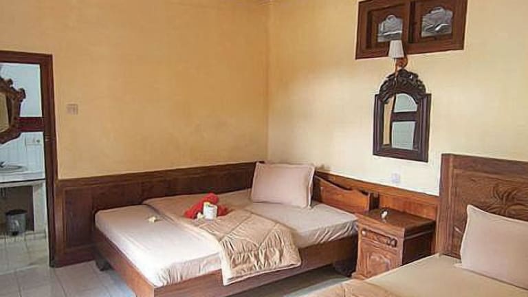 Die Zimmer im Ganesha Ubud Inn sind im traditionellen javanischen Stil eingerichtet und bieten eine authentische Atmosphäre. Mit Holzelementen und traditionellen Möbeln strahlen die Zimmer eine warme und gemütliche Atmosphäre aus. Zur Ausstattung gehören ein Schreibtisch, ein Kleiderschrank und eine private Terrasse oder ein Balkon. Das Badezimmer ist mit einer Dusche und einer Badewanne ausgestattet.