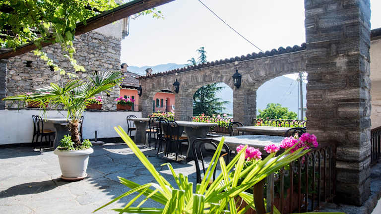 In den Sommermonaten können die Gäste die ruhige Veranda mit Holzdecken und traditionellen Möbeln nutzen, um die Aussicht auf die Alpen und den Lago Maggiore zu genießen. Die Hotelbar verfügt über einen offenen Kamin, der in den kälteren Monaten für eine gemütliche Atmosphäre sorgt. Hier können die Gäste regionale Weine probieren und sich entspannen.