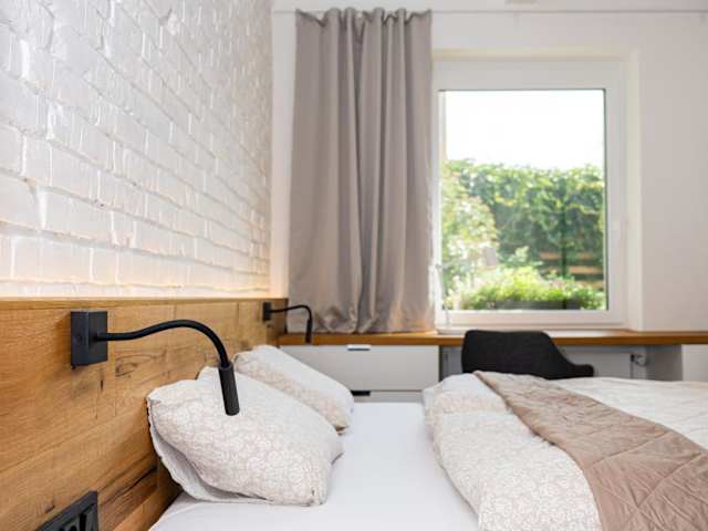 Die Ferienwohnung besteht aus einem Schlafzimmer und einem Wohnzimmer und ist mit einem Flachbild-TV, einem Kühlschrank sowie einem Ofen ausgestattet. Es gibt ein Badezimmer mit Dusche und es werden Handtücher sowie Bettwäsche bereitgestellt. Die Unterkunft verfügt über Nichtraucherzimmer und bietet einen Blick auf den Garten.