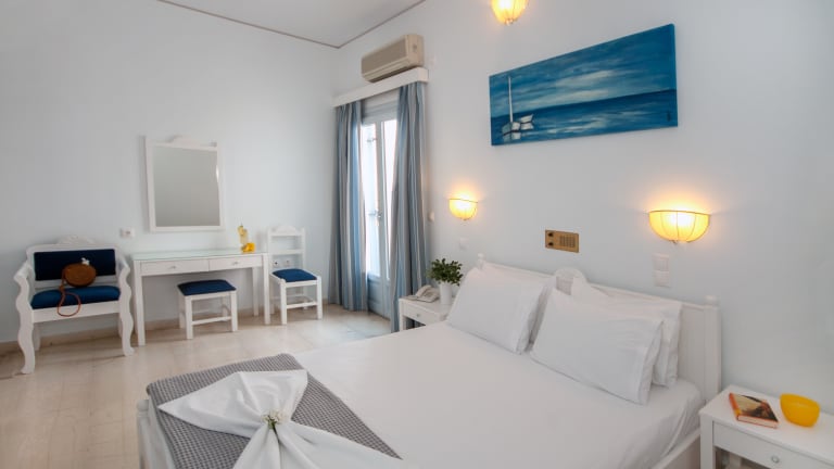 Geraeumige Zimmer, hell und freundlich im Kykladenstil eingerichtet mit allen modernen Ausstattungen fuer einen erholsamen Urlaub.