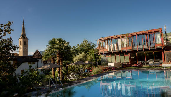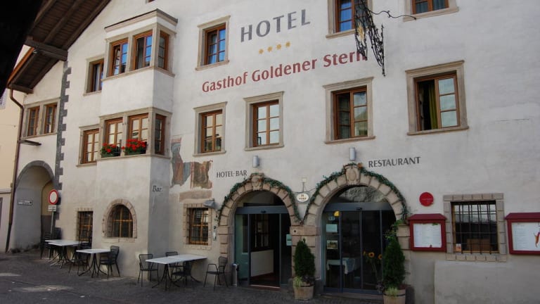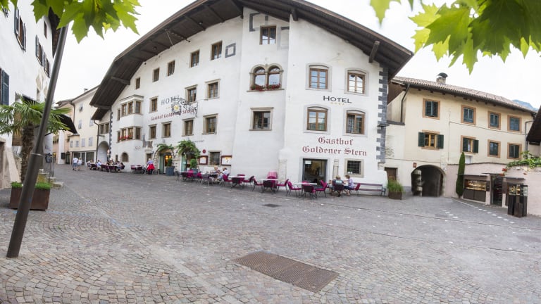 TRETE EIN! COME IN. Ins Hotel Goldener Stern in Kaltern Das Hotel Goldener Stern in Kaltern vereint Aktivsein, Ruhefinden und Stadtleben in einem – und zwar mittendrin im lebendigen Kalterer Kern. Bars, Boutiquen, Restaurants … und der Reiz eines historischen Ortes rundum. (Wein-)Berge, Kalterer See, die Landeshauptstadt Bozen – von hier aus ist ganz Südtirol bald erreicht, auch mit den öffentlichen Verkehrsmitteln. Und im SPA samt Poolgarten lässt sich’s herrlich entspannen – als wärst du mitten im grünen Nichts.