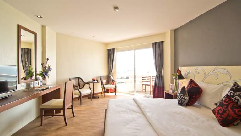 Das Grand Jomtien Palace Hotel bietet insgesamt 361 Zimmer in einem 14-stöckigen Haupthaus und einem Nebengebäude. Die Zimmer sind komfortabel eingerichtet und verfügen über einen privaten Balkon mit Blick auf das Meer oder den Garten. Zur Ausstattung gehören ein Kabel-TV, ein Kühlschrank und eine Minibar.