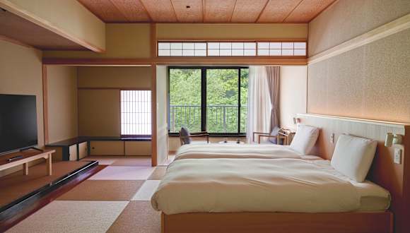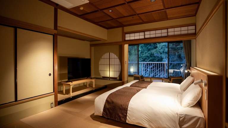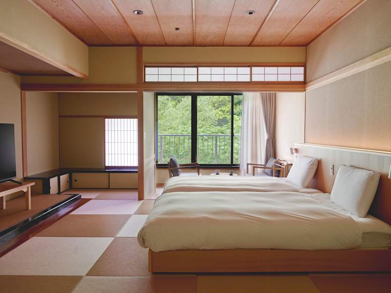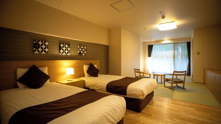 Das Hotel verfügt über 76 Zimmer auf 5 Etagen, die mit einem Aufzug erreichbar sind. Die Zimmer sind im traditionellen japanischen Stil eingerichtet und bieten den Gästen ein authentisches Erlebnis. Jedes Zimmer ist klimatisiert und verfügt über ein eigenes Thermalbad. WLAN steht den Gästen in der Lobby kostenlos zur Verfügung.