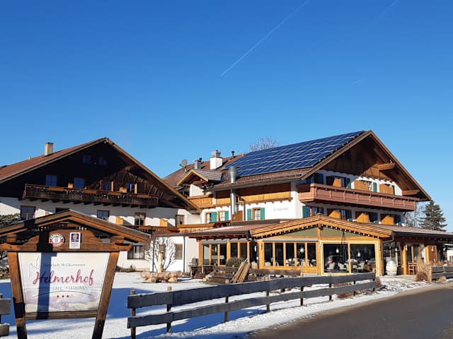 Der Helmerhof bietet seinen Gästen traditionelle und romantisch gestaltete Zimmer, die den Charme der Region widerspiegeln. Einige Zimmer bieten einen direkten Blick auf das Schloss Neuschwanstein. Für zusätzlichen Komfort steht ein Spa-Bereich zur Verfügung, in dem Sie sich nach einem ereignisreichen Tag entspannen können.