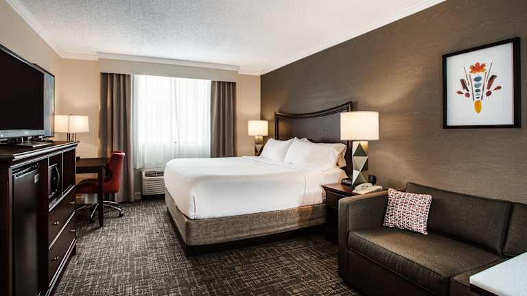 Die geräumigen Zimmer im Holiday Inn Resort Lake George bieten modernen Komfort und Annehmlichkeiten. Jedes Zimmer verfügt über kostenloses WLAN, einen Flachbild-TV und einen Schreibtisch mit großem Sitzbereich. Die Gäste können sich in ihrem Zimmer entspannen und den Aufenthalt in vollen Zügen genießen.