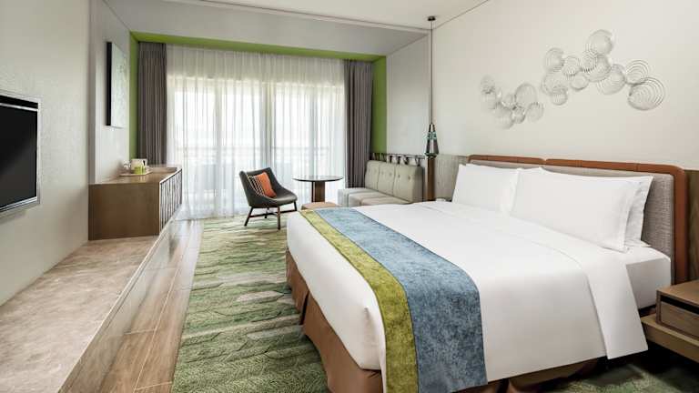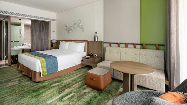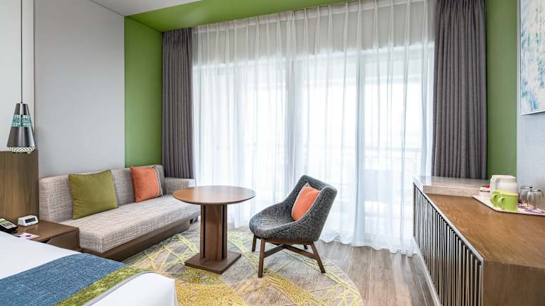 Die Zimmer sind modern eingerichtet und verfügen über einen Balkon oder eine private Terrasse. Zur Ausstattung gehören eine Klimaanlage, ein Safe, eine Minibar und ein Schreibtisch sowie ein Telefon und ein Flachbild-TV. Im Badezimmer sind Dusche oder Badewanne, Haartrockner und Bademäntel vorhanden. Es gibt Familien-, Nichtraucher- und Raucherzimmer sowie rollstuhlgerechte Unterkünfte.