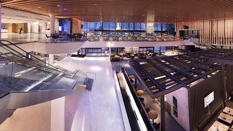 Das Hotel bietet eine Vielzahl von gastronomischen Einrichtungen, darunter das Stetsons Modern Steak + Sushi, das exquisite Gerichte wie Koteletts, Fisch und Meeresfrüchte in einer eleganten Atmosphäre serviert. Das Market Chicago bietet rund um die Uhr Starbucks-Kaffee, Sandwiches und Frühstückszutaten. Die BIG Bar bietet einen atemberaubenden Stadtblick und serviert Cocktails nach Art des Hauses. Die American Craft Kitchen & Bar bietet Sandwiches und Salate für Mittag- und Abendessen.