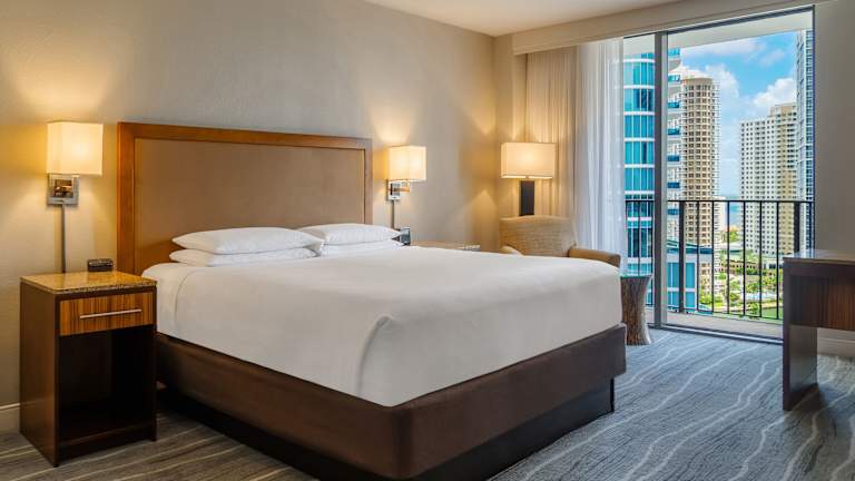 Das Hyatt Regency Miami verfügt über 612 Nichtraucherzimmer, die sich auf 24 Etagen verteilen. Die Zimmer sind über einen Aufzug erreichbar und bieten modernen Komfort und Annehmlichkeiten. Zur Ausstattung gehören ein Safe, ein Schreibtisch, kostenfreies WLAN und ein eigenes Badezimmer.