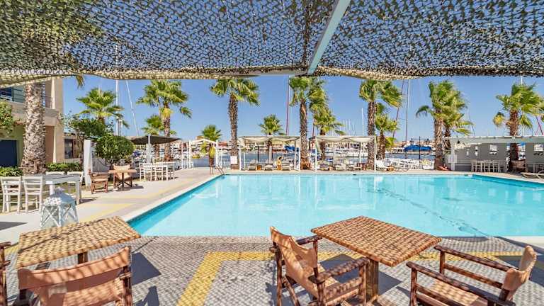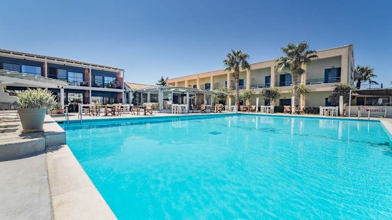 Genießen Sie ein köstliches Frühstücksbuffet am Pool, um gestärkt in den Tag zu starten. Das Ianos Hotel verfügt auch über eine Poolbar, die den ganzen Tag über kleine Mahlzeiten, Getränke und Cocktails serviert.