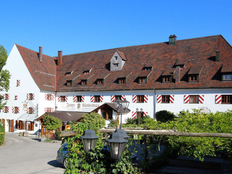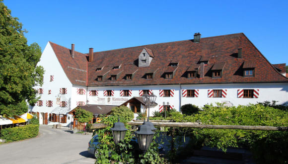 Im Klosterbräu Braugasthof gibt’s gute bayrische allgäuer Küche, frisch Gezapftes kommt aus dem Gewölbekeller. Im historischen Gemäuer und in den Gärten gefällt es Gästen in angenehm lockerer Atmosphäre. Hinter dicken Klostermauern schlafen Sie ruhig und fest. Genau richtig nach ein paar mild würzigen Klosterbieren. In Irsee wird ursprünglich gebraut. Wer mag, kann dabei zuschauen. Ihr Bekenntnis zur Lebensfreude und zu weltlichen Genüssen war ein Schlüssel zum Wohlbefinden der früheren Mönche. Bei Klosterbräu in Irsee begann in den 70er- Jahren das Erforschen des Ursprünglichen. Irsee einst ... Die Geschichte von Kloster Irsee beginnt um 1182. Auf- und Niedergang wechselten über die Jahunderte. Man hatte Spaß an den Wissenschaften und an Musik, aber auch an Bodenständigem wie Bier und gutem Essen. 1803, mit Auflösung des Klosters, wurde es im Klosterviertel ruhig. 1970 tauchte die Idee „Vorwärts zum Ursprung“ auf. Liebevoll wurden Gemäuer, Gewölbe und Fresken des historischen Klosterbraugasthofs mit seinen Gästezimmern restauriert. In der Klosterbrauerei besann man sich wieder des ursprünglichen Klosterbierbrauens. 1982 war auch die Klosterkirche wieder hergestellt. Das Klosterviertel wurde neu „entdeckt“ und zu einem Ort der Lebensfreude und des ursprünglichen Genusses. Irsee heute ... In den historischen Mauern des Klosterbraugasthofs treffen sich Gäste in geselliger Runde und genießen die bayrisch- allgäuer Klosterküche. Ursprünglich gebrautes, mildwürziges Klosterbier reift im Gewölbekeller. Im jahundertealten Gebäude des Klosterhotels übernachten Reisende, Geschäftsleute und Familien ruhig hinter dicken Klostermauern. Bei den Gästezimmern wurde der Charme des Ursprünglichen bewahrt, ohne auf Komfort zu verzichten. Spaziergänger folgen den alten Wegen rund ums Klosterviertel. Gäste kommen auch gerne hierher, um ein paar Tage in Ruhe auszuspannen und sich's gut gehen zu lassen. Irsee ist heute ein Ort, an dem Sie weltliche Lebensfreude und Gastfreundschaft genießen können.