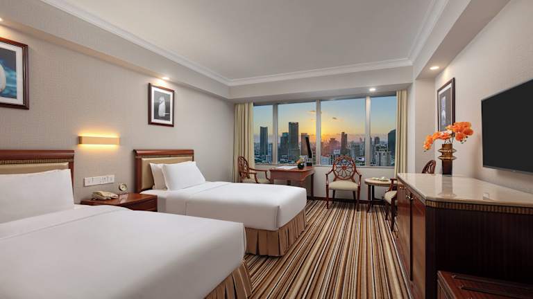 Die luxuriösen Unterkünfte im Jin Jiang Tower Hotel sind geräumig und mit hochwertiger Bettwäsche und Möbeln ausgestattet. Jedes Zimmer verfügt über ein elegantes Badezimmer mit Badewanne und Dusche sowie über Annehmlichkeiten wie Kabel-TV und Haartrockner.