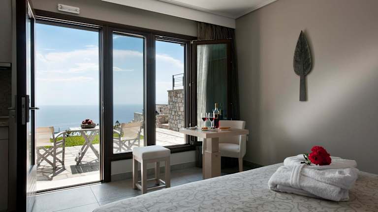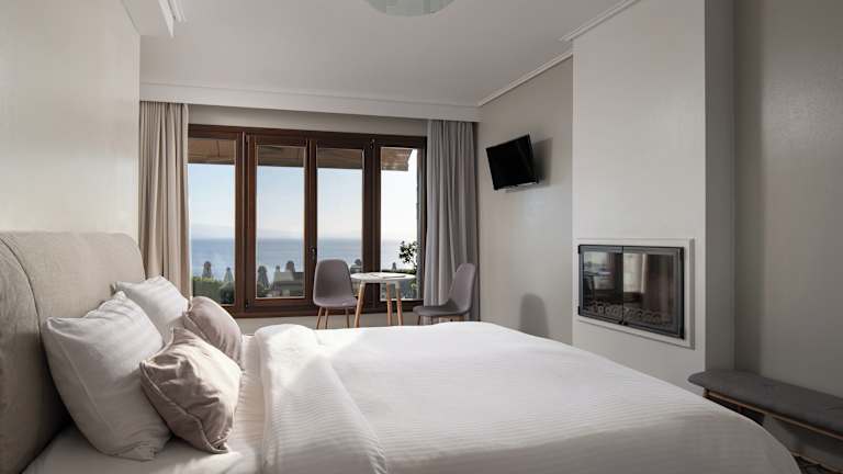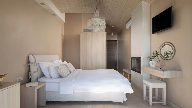 Die Zimmer im Karavia Lux Inn sind elegant eingerichtet und bieten Ihnen einen komfortablen Rückzugsort. Die Matratzen von Coco-mat sorgen für einen erholsamen Schlaf und die handgefertigten Kunstwerke verleihen den Zimmern eine besondere Note. Jedes Zimmer verfügt über einen möblierten Balkon oder eine Terrasse mit Panoramablick auf das Meer, den Pool und die Berge. Ein geothermisches Kühl- und Heizsystem sorgt für angenehme Temperaturen zu jeder Jahreszeit und ein 32-Zoll-Flachbild-TV steht Ihnen zur Verfügung. Das moderne Badezimmer ist mit einer Duschkabine ausgestattet und einige Zimmer bieten zudem einen gemütlichen Kamin.